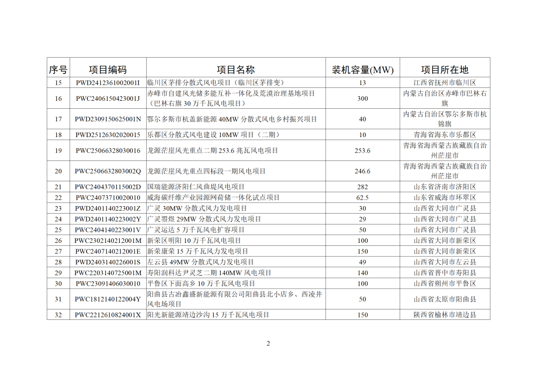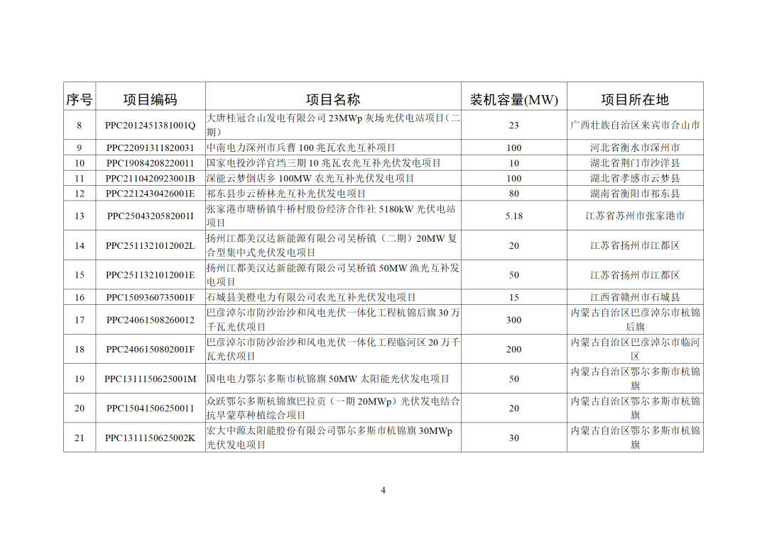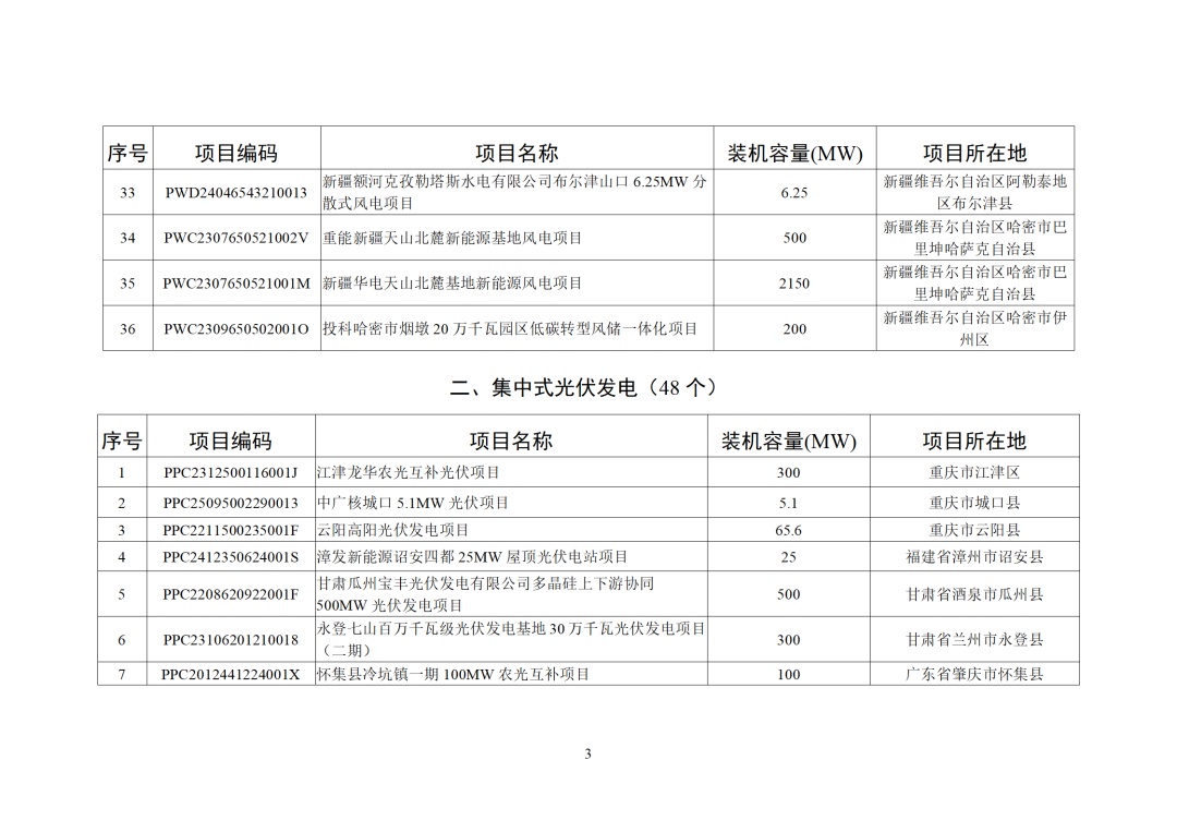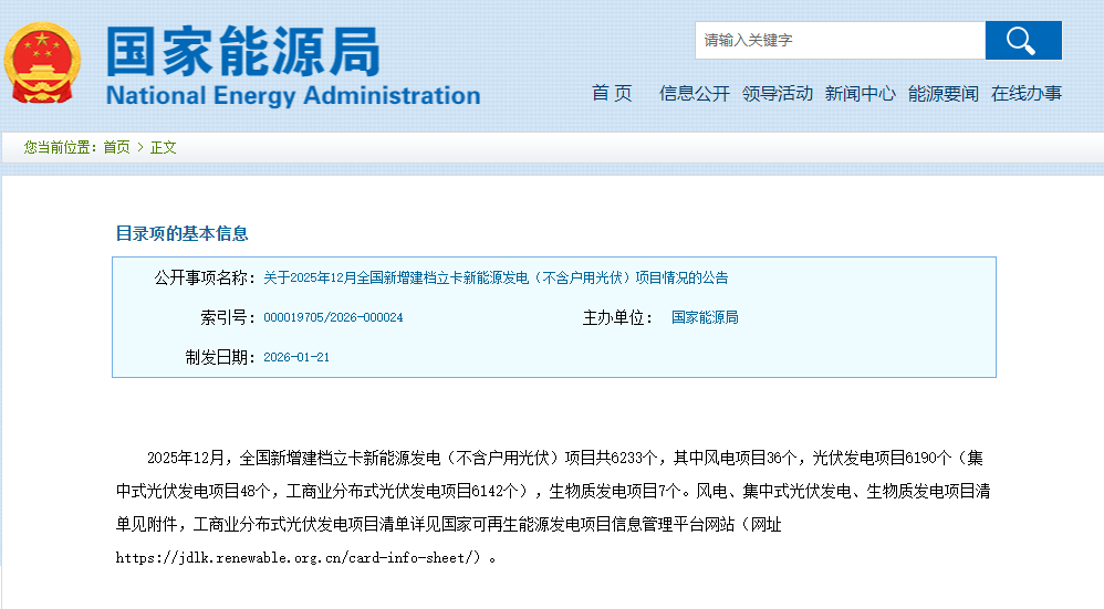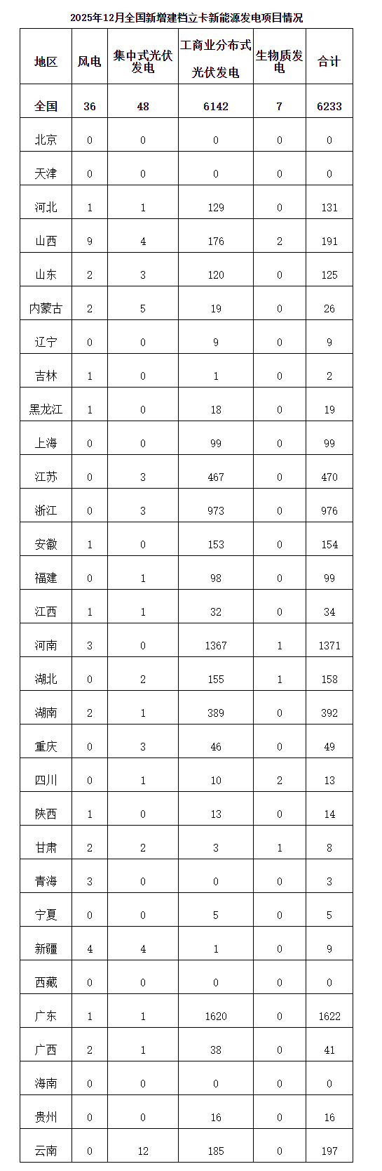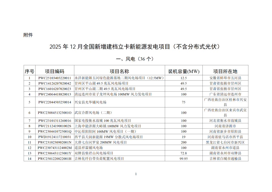 2025年12月,全国新增建档立卡新能源发电(不含户用光伏)项目共6233个,其中风电项目36个,光伏发电项目6190个(集中式光伏发电项目48个,工商业分布式光伏发电项目6142个),生物质发电项目7个。风电、集中式光伏发电、生物质发电项目清单见附件,工商业分布式光伏发电项目清单详见国家可再生能源发电项目信息管理平台网站(网址https://jdlk.renewable.org.cn/card-info-sheet/)。