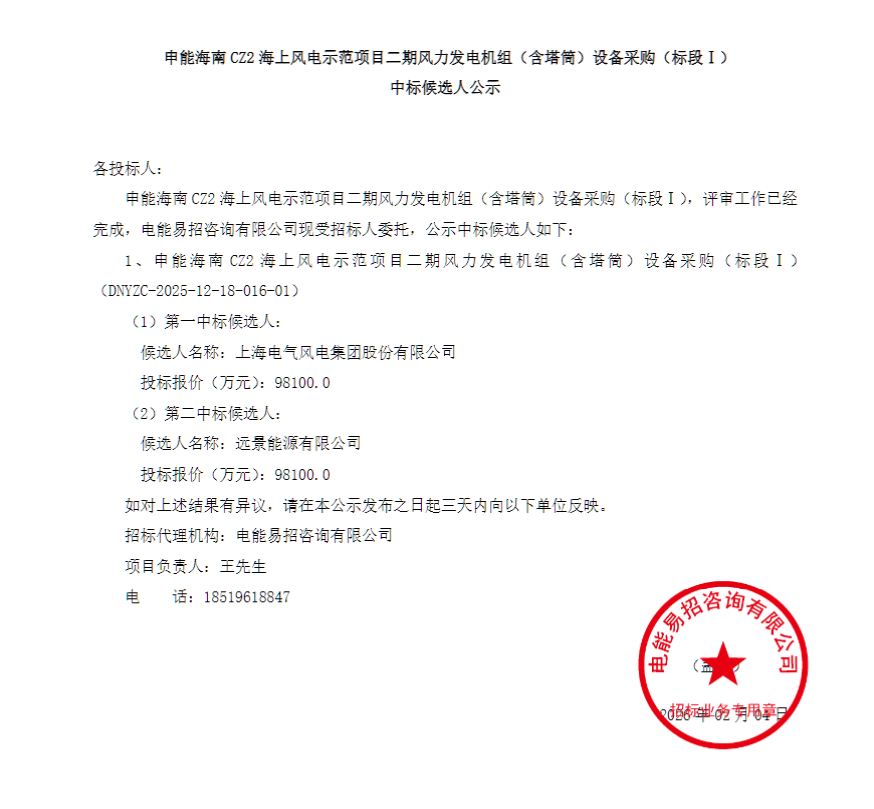 据悉,申能海南CZ2二期海上风电示范项目场址位于海南省儋州市北面海域,规划总容量1200MW,共配套建设2座220kV海上升压站和1座陆上集控中心,分两期建设,项目一期603MW已于2025年3月全容量并网发电。项目二期建设容量576MW。标段I招标采购风力发电机组设备总容量300MW,共25台套。标段II招标采购风力发电机组设备总容量276MW,共23台套。单机设备要求为12MW,钢制塔筒,轮毂高度为140米。单桩基础顶高程为+13米、导管架基础顶法兰高程为+18米,叶尖最高高度不高于271米。交货计划:标段I合同设备须2026年7月前全部到货。标段II合同设备须2026年9月前全部到货。