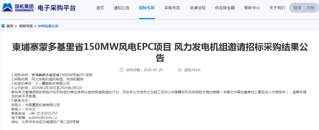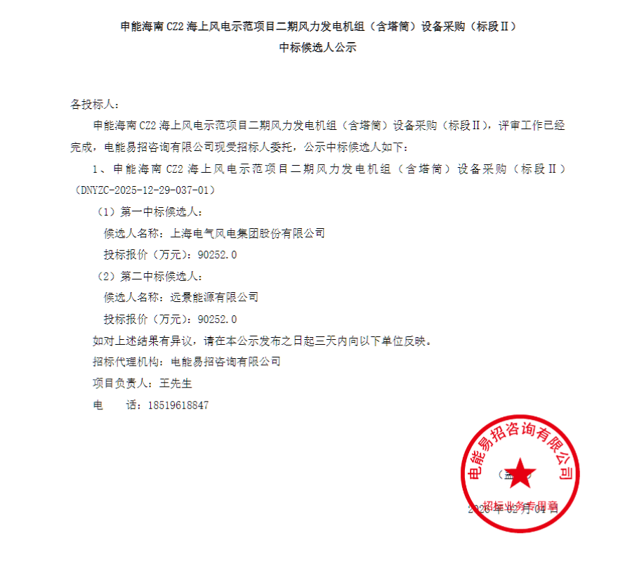 能源圈获悉,近日,申能海南CZ2海上风电示范项目二期、中广核新能源山东莒县175MW陆上风电项目、中国电建武鸣灵马风电场项目、柬埔寨蒙多基里省150MW风电EPC项目风力发电机组采购中标/中标候选公示,规模合计1086MW。