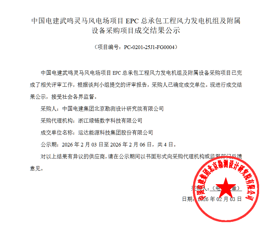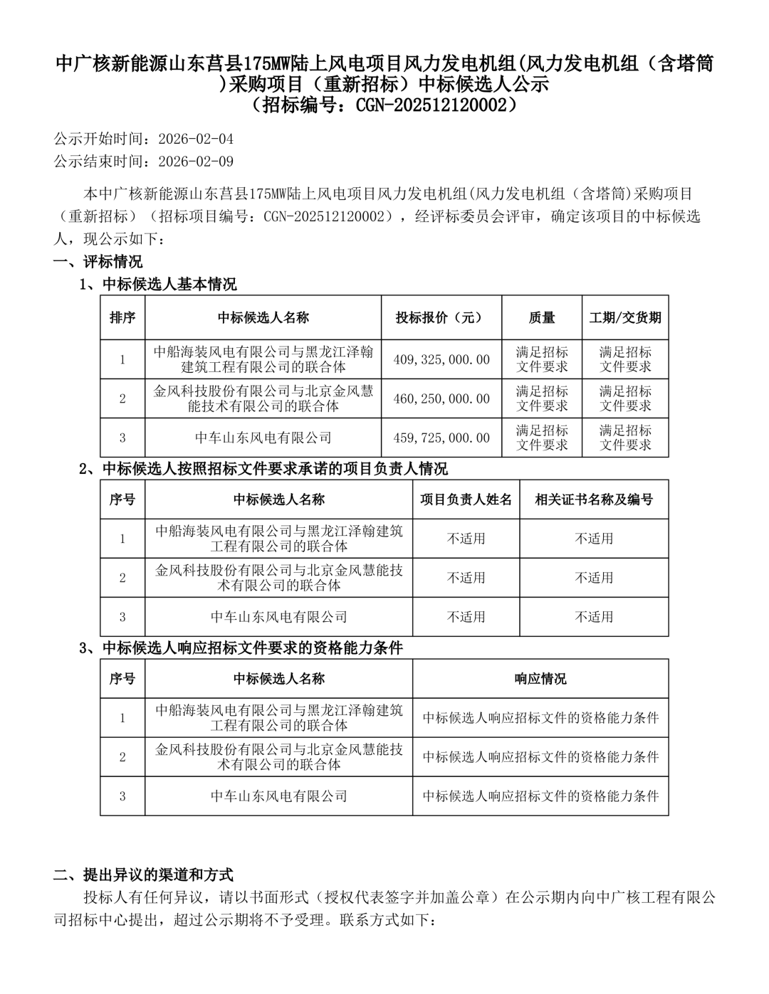 根据公示,电气风电、运达股份、三一重能、中船海装与黑龙江泽翰建筑工程有限公司的联合体为中标人/第一中标候选人。