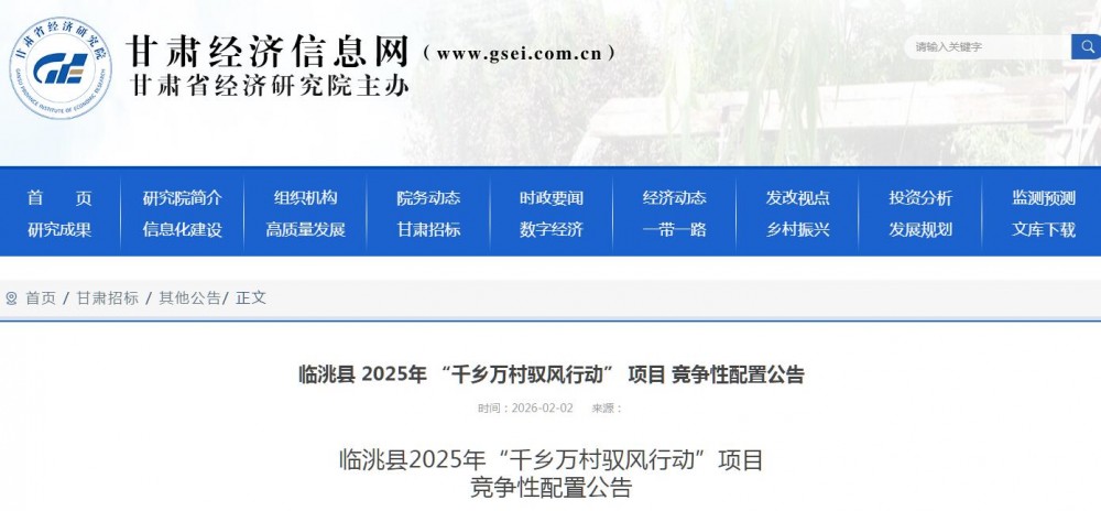 2月2日,甘肃经济信息网发布临洮县2025年 “千乡万村驭风行动” 项目竞争性配置公告。
