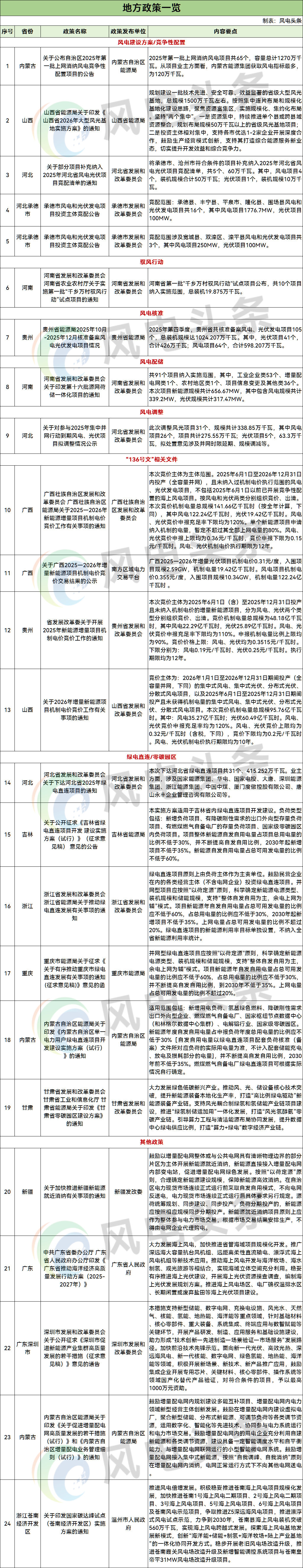 内蒙古、山西、河北等4个地方下发相关文件。内蒙古公布2025年第一批上网消纳风电竞配项目;山西印发2026年大型风光基地实施方案;河北60万千瓦风光项目补充纳入2025年河北省风电光伏项目竞配清单;河北承德市2.23GW风光项目启动竞配。