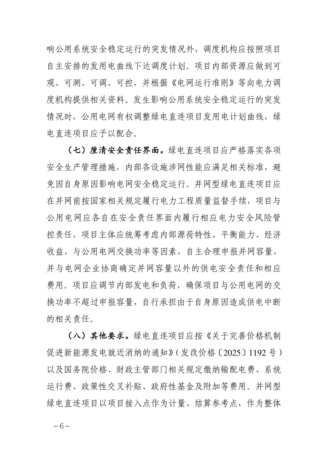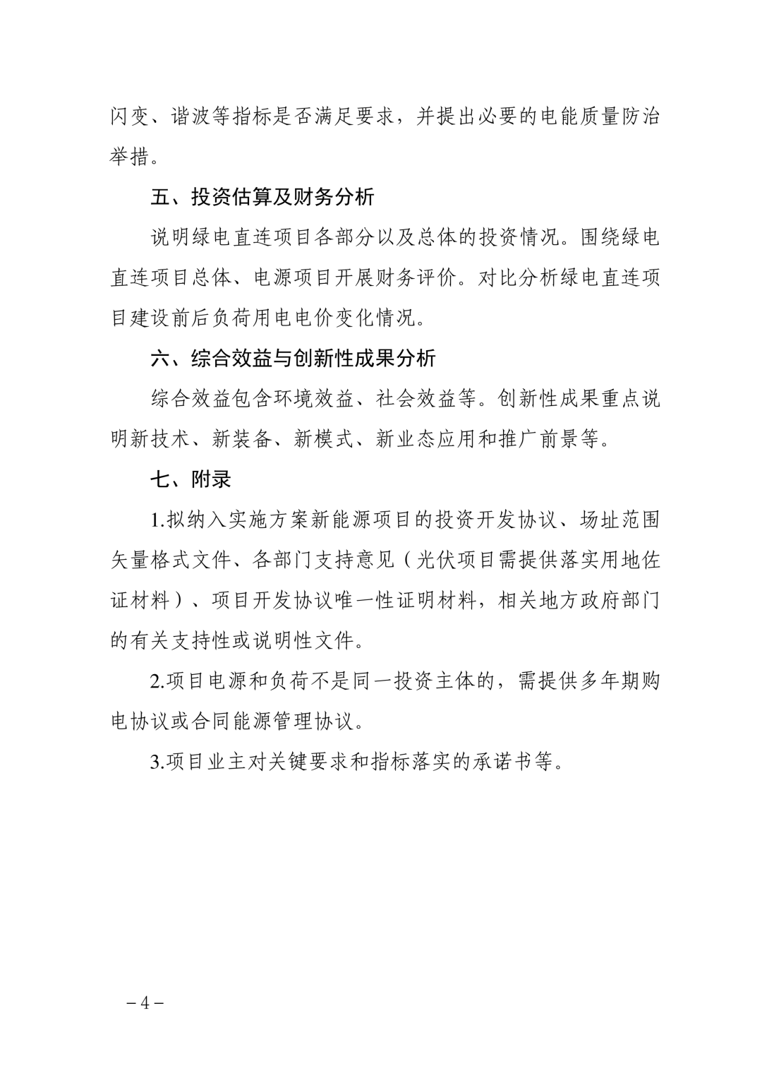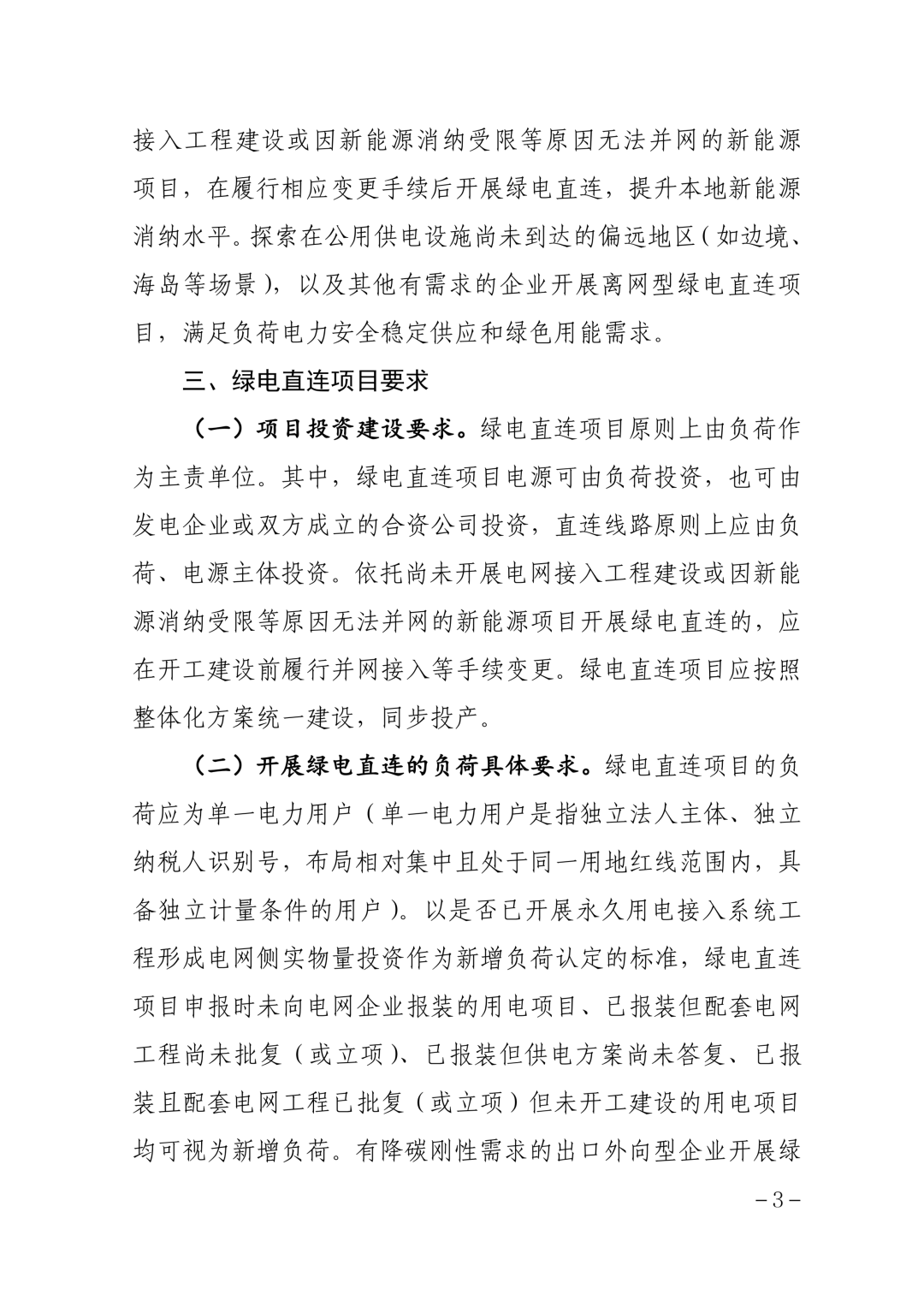 探索绿电直连多元化应用场景。支持尚未开展电网接入工程建设或因新能源消纳受限等原因无法并网的新能源项目,在履行相应变更手续后开展绿电直连,提升本地新能源消纳水平。探索在公用供电设施尚未到达的偏远地区(如边境、海岛等场景),以及其他有需求的企业开展离网型绿电直连项目,满足负荷电力安全稳定供应和绿色用能需求。