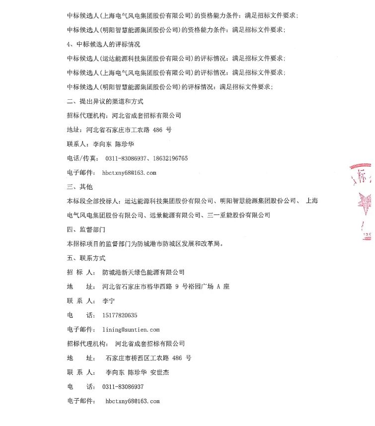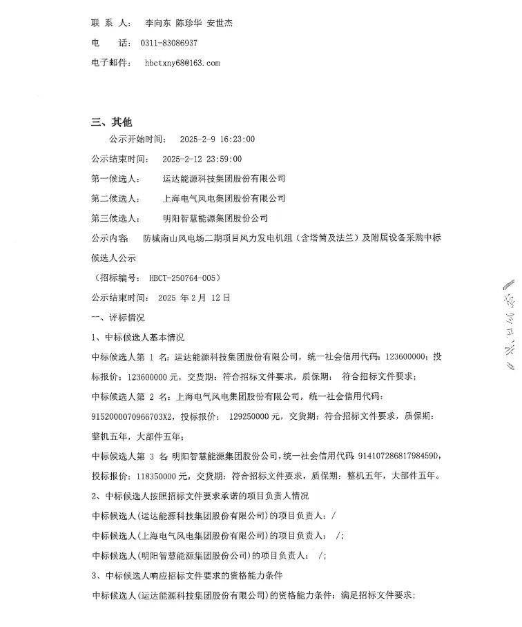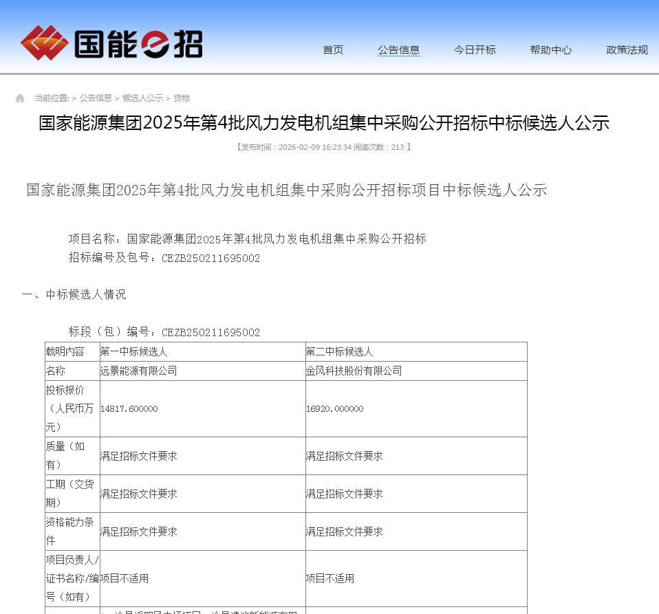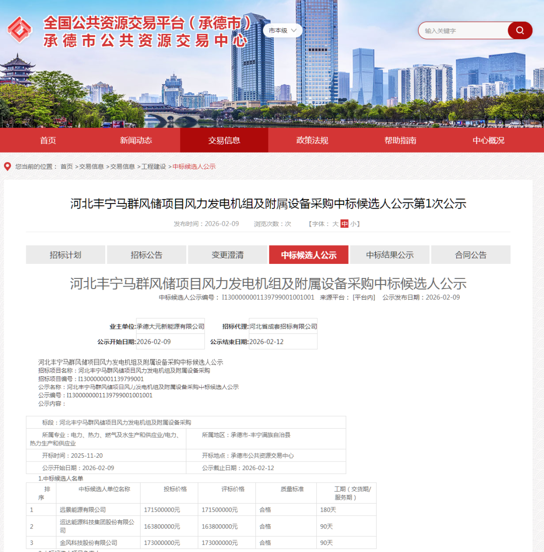 根据公示,远景能源、运达股份作为第一中标候选人预中标。