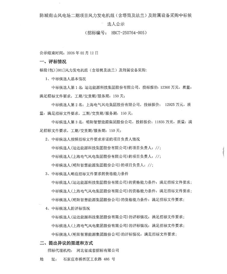 河北丰宁马群风储项目位于河北省承德市丰宁满族自治县外沟门乡、万胜永乡、四岔口乡境内,建设规模100MW,交货时间:风力发电机组及附属设备交货时间:第一批次:全部预应力锚栓组合件到场时间:2026年1月30日;第二批次:首批50MW风机到场时间:2026年3月30日。第三批次:剩余风机到场时间:2026年4月30日。