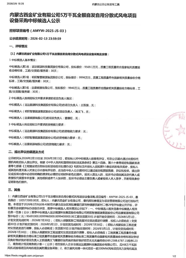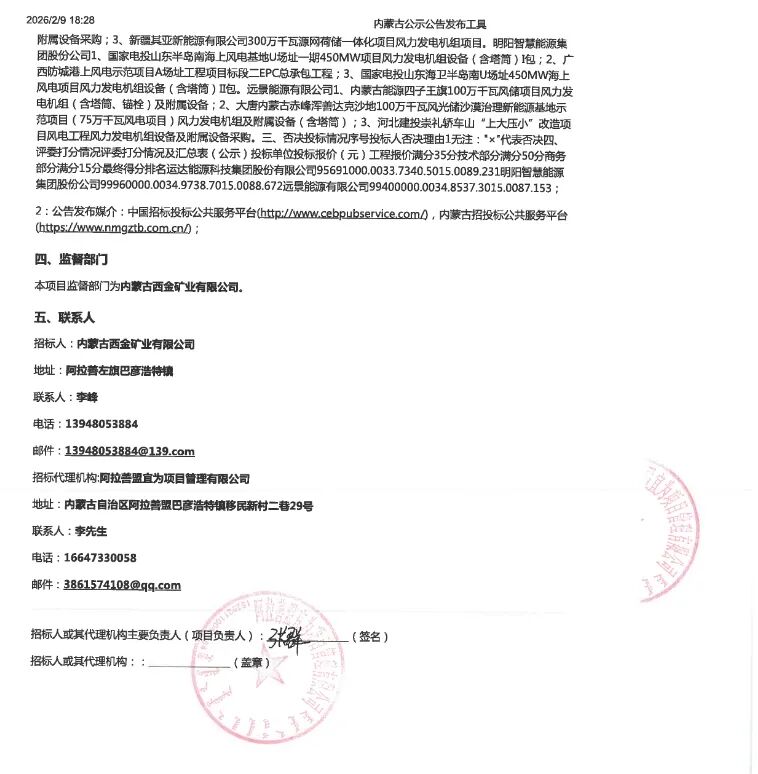 内蒙古西金矿业有限公司5万千瓦全额自发自用分散式风电项目位于内蒙古阿拉善左旗巴彦诺日公苏木,新建风电项目总装机容量5万千瓦,建设风电机组、箱变、集电线路杆塔、1座35kV开关站及进站道路等设施;设备交货期:交货期30日,计划开始交货时间:2026年5月1日,计划交货完成时间:2026年7月30日。