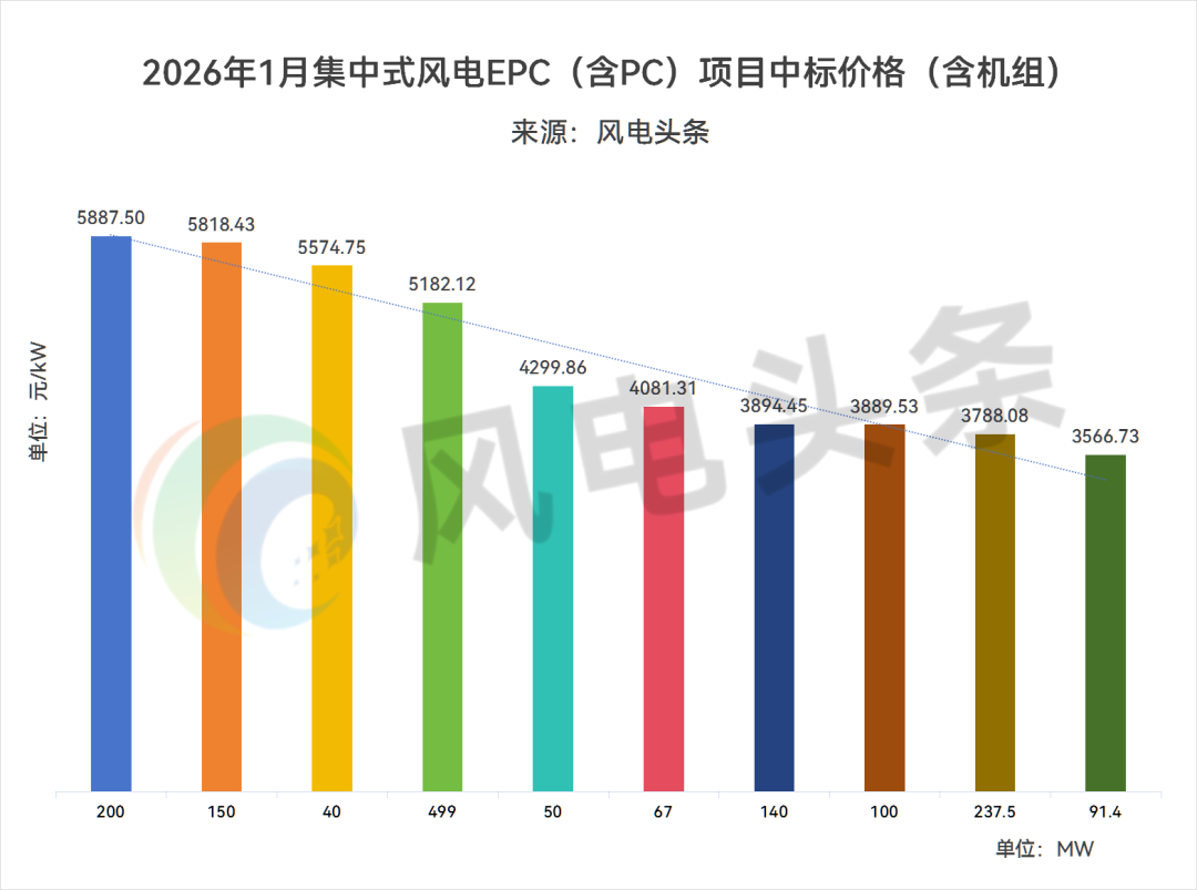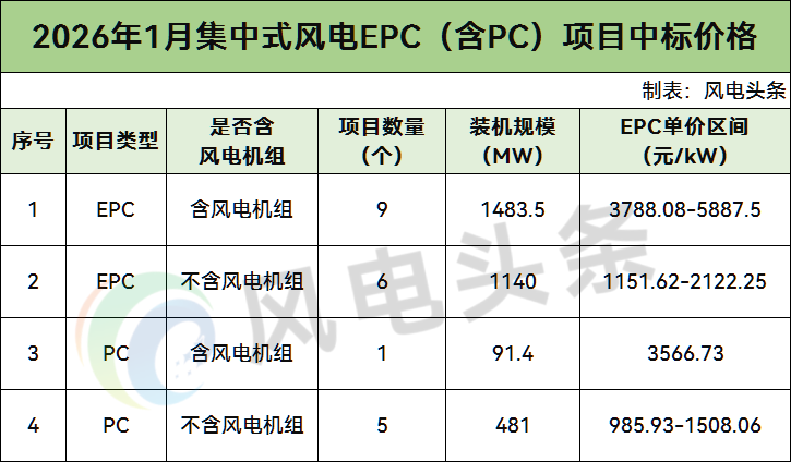 2026年1月央国企开发商中,集中式风电EPC(含PC)项目中标单价区间在985.93-5887.5元/kW。分散式风电EPC项目中标单价区间在3960-5442.4元/kW。海上风电EPC项目中标单价为7065.92元/kW。