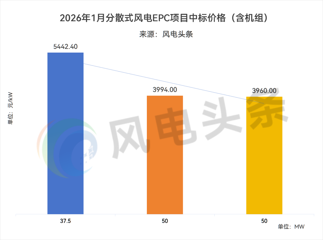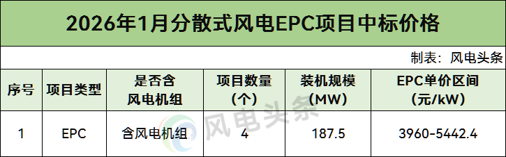 根据能源圈风电项目数据库统计显示,2026年1月央国企开发商中,分散式风电EPC项目共计4个,规模总计187.5MW,中标单价区间在3960-5442.4元/kW。