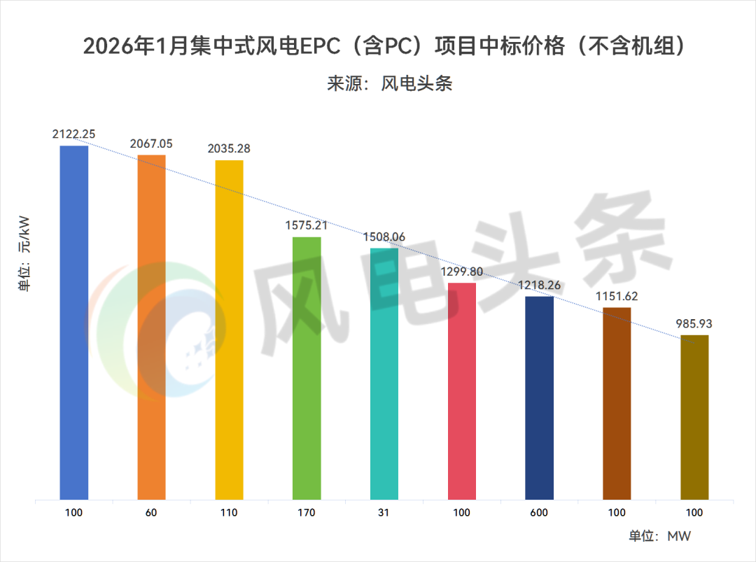 根据能源圈风电项目数据库统计显示,2026年1月央国企开发商中,集中式风电EPC(含PC)项目共计21个,规模总计3195.9MW,中标单价区间在985.93-5887.5元/kW。
