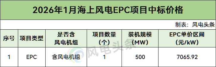 根据能源圈风电项目数据库统计显示,2026年1月央国企开发商中,海上风电EPC项目共计1个,规模总计500MW,中标单价为7065.92元/kW。
