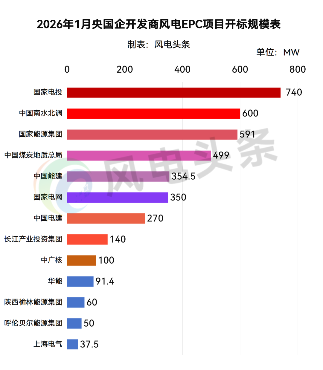 4、从开发商角度来看,2026年1月,央企EPC(含PC)项目开标容量为3595.9MW,国企EPC(含PC)项目开标容量为287.5GW。其中,央国企总排名中,国家电投开标容量领先第一,开标容量达740MW,占比19.06%。