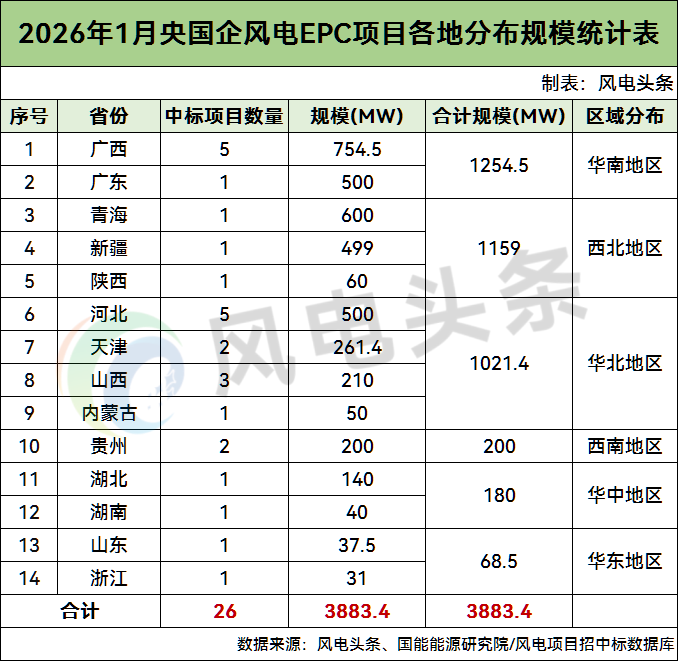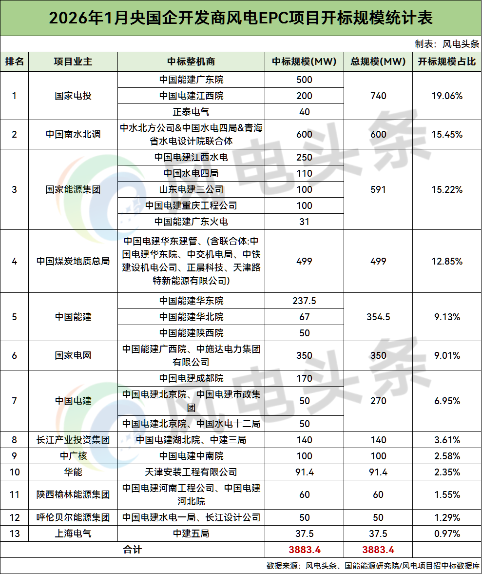 能源圈通过风电项目数据库分析发现,2026年1月央国企累计26个风电EPC(含PC)项目开标,累计容量达到3883.4MW(约3.88GW)。