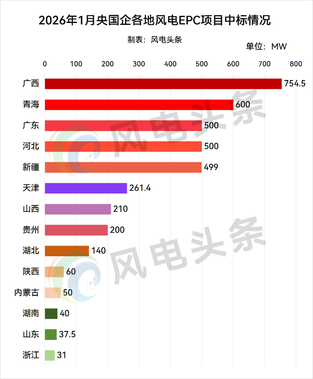3、从区域分布来看,2026年1月,风电EPC(含PC)项目主要集中在华南、西北地区,华南地区项目最多,达1254.5MW,涉及省份有广西、广东。规模最大的省份是广西,1月开标容量达754.5MW,占比19.43%。