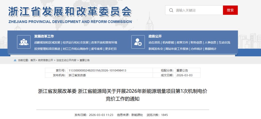 3月3日,浙江省发展改革委、浙江省能源局发布《关于开展2026年新能源增量项目第1次机制电价竞价工作的通知》。
