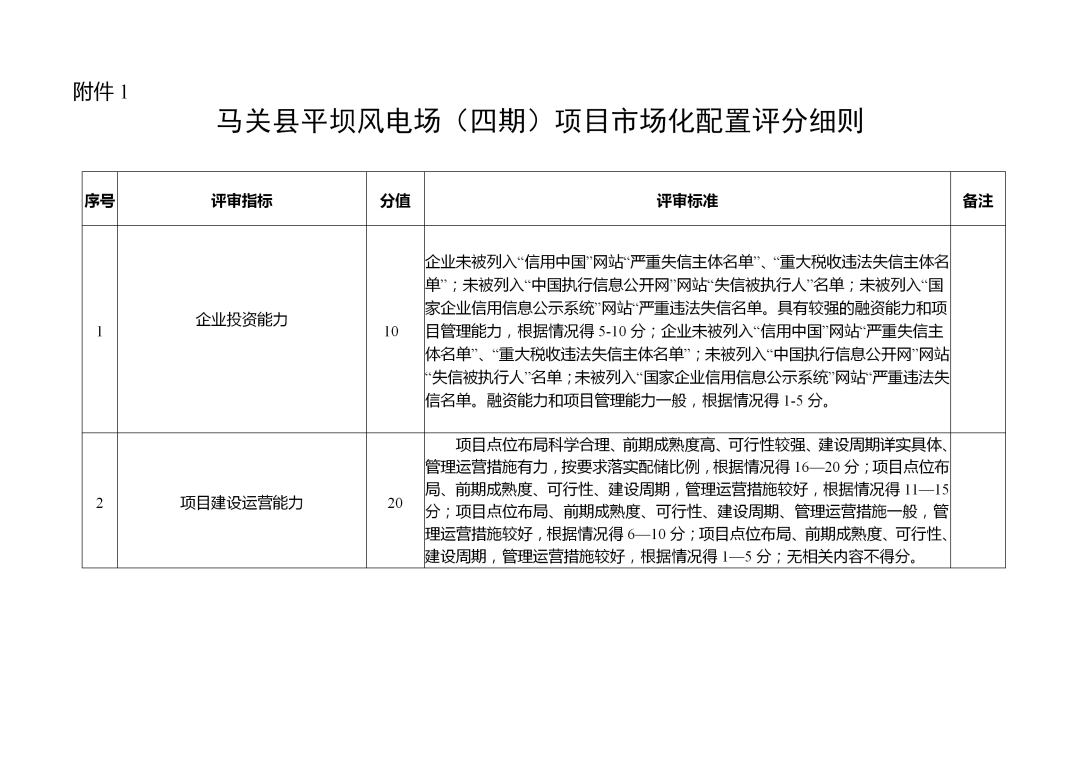 附件:1.马关县平坝风电场(四期)项目市场化配置评分细则