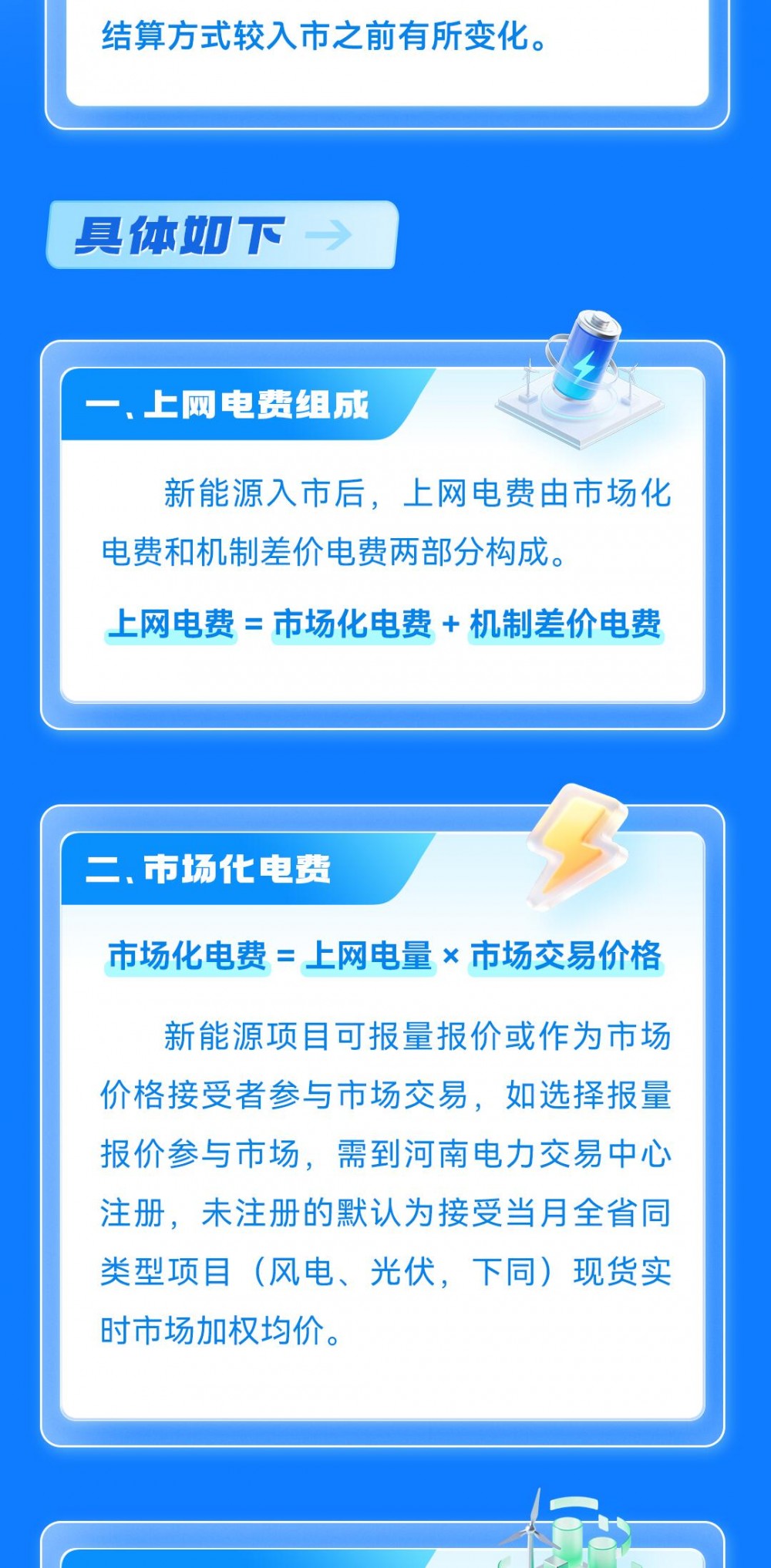 2026年1月1日起,河南省新能源上网电量全部进入电力市场,上网电价通过市场交易形成,不再执行固定价格,并同步在市场外建立新能源可持续发展价格结算机制,新能源上网电费组成和结算方式较入市之前有所变化。
