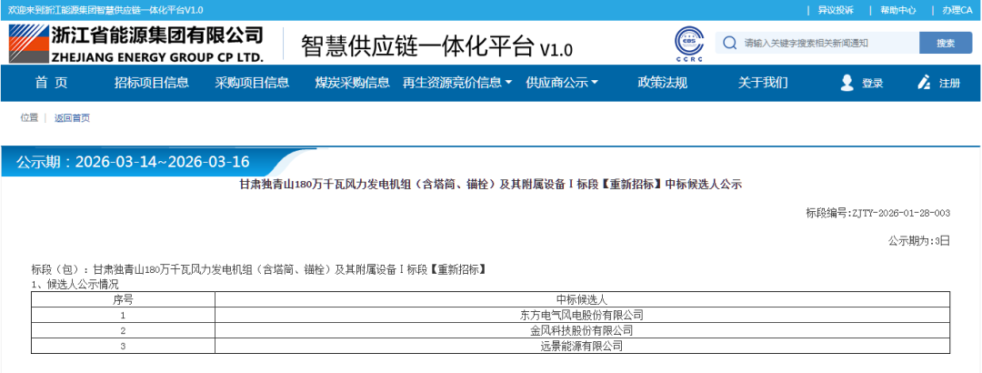 能源圈获悉,3月13日,甘肃独青山180万千瓦风力发电机组(含塔筒、锚栓)及其附属设备Ⅰ标段、Ⅱ标段、Ⅲ标段【重新招标】中标候选人公示。