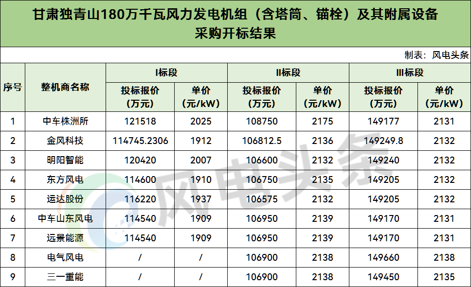 据悉,3月9日,甘肃独青山180万千瓦风力发电机组(含塔筒、锚栓)及其附属设备Ⅰ标段、Ⅱ标段、Ⅲ标段开标结果公示,共有9家整机商竞标。