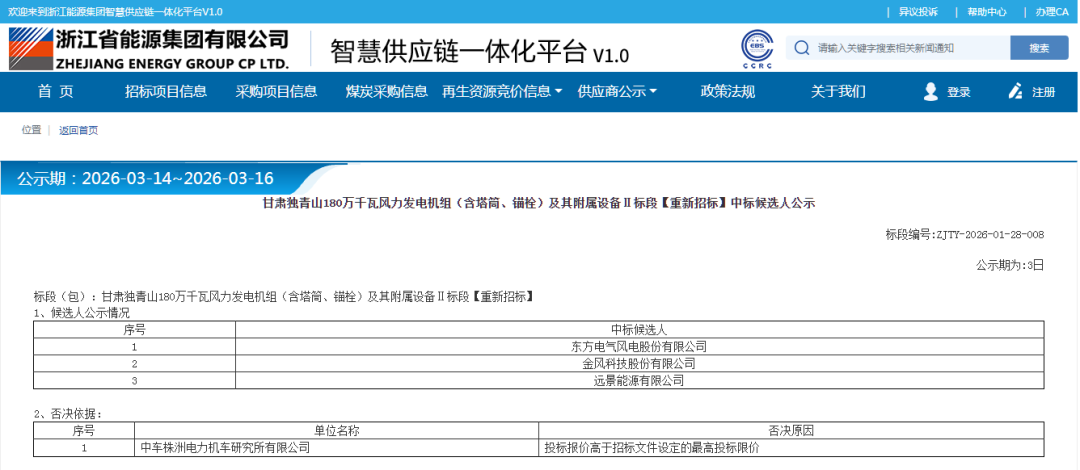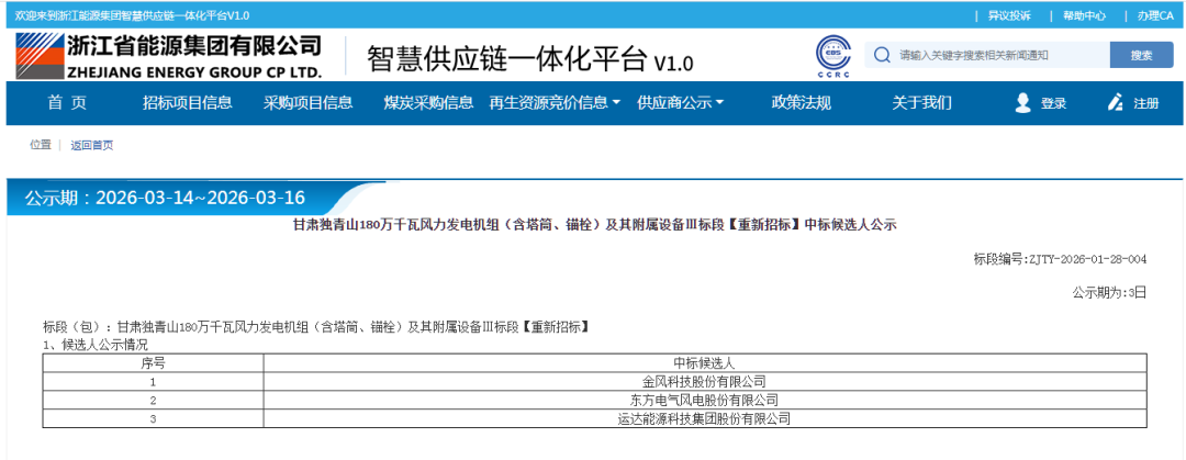 根据公示,东方风电、金风科技作为第一中标候选人预中标。