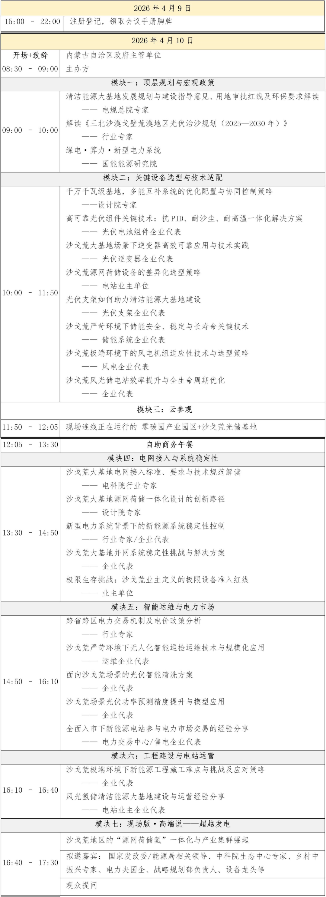 但规模越大、挑战越实!项目如何高效落地?生态治理成本如何平衡?如何破解绿电外送瓶颈、优化投资回报模式?如何推动风光储氢充集成融合发展?这些问题,都需要行业同仁共同探索答案。此背景下,亟需搭建一个高规格、专业化、实效化的交流协作平台,把政策讲透、把技术落地、把项目对接实,真正解决规划落地、消纳瓶颈、投资收益、生态协同四大核心问题,探索 “绿电 + 治沙 + 产业” 可持续发展模式。承行业同仁的殷切期待,2026 年 4 月 10 日,由、国能能源研究院主办,光伏头条、能源圈、储能头条、充换电头条、氢能汇承办,内蒙古太阳能行业协会支持的“2026沙戈荒清洁能源大基地(西北)高质量发展大会”将在 “沙戈荒第一现场”—— 呼和浩特召开。大会将直击企业、投资、建设、运维各方真实痛点,聚焦西北地区清洁能源大基地建设,围绕政策、沙戈荒布局、特高压外送、东数西电、技术装备、运营管理、电力市场、生态协同、绿色金融及源网荷储算一体化等议题展开深度研讨,提供政策解读、技术方案、项目对接、资源匹配的务实交流,助力行业高质量发展!