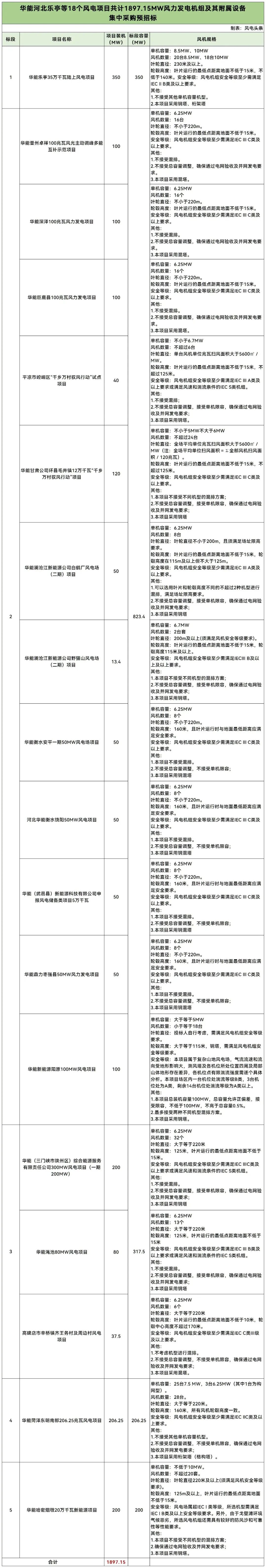 2025年8月22日,华能河北乐亭等18个风电项目共计1897.15MW风力发电机组及其附属设备集中采购预招标招标公告发布。