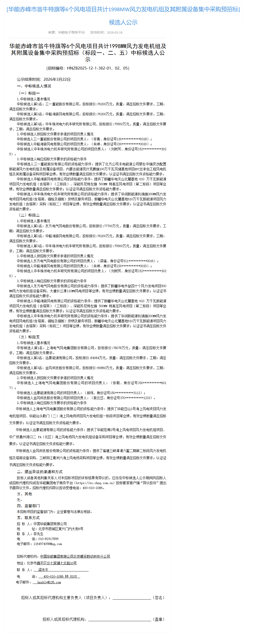 此前,2025年12月25日,华能赤峰市翁牛特旗等6个风电项目共计1998MW风力发电机组及其附属设备集中采购预招标公告发布。