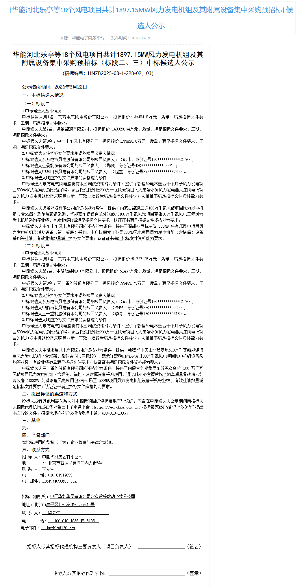 此外、东方风电(1140.9MW)作为华能河北乐亭等18个风电项目共计1897.15MW风力发电机组及其附属设备集中采购标段二、三第一中标候选人预中标。