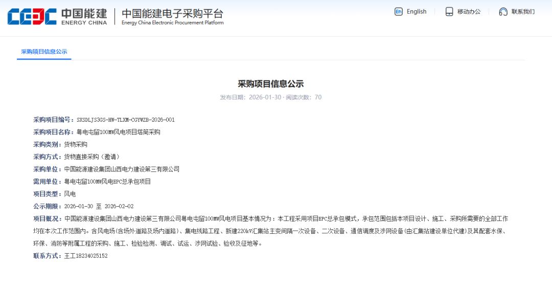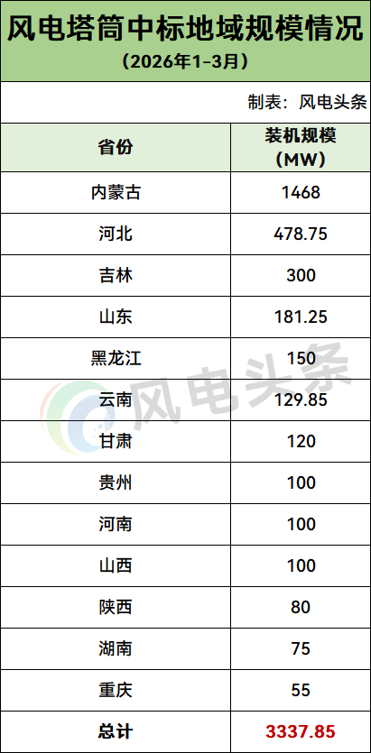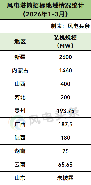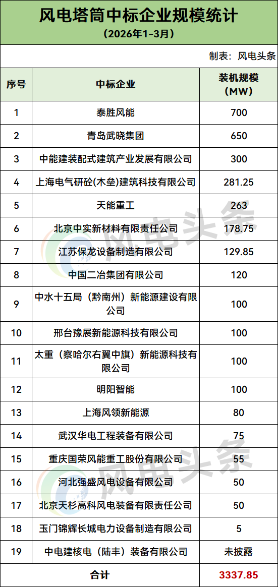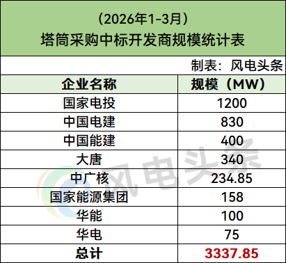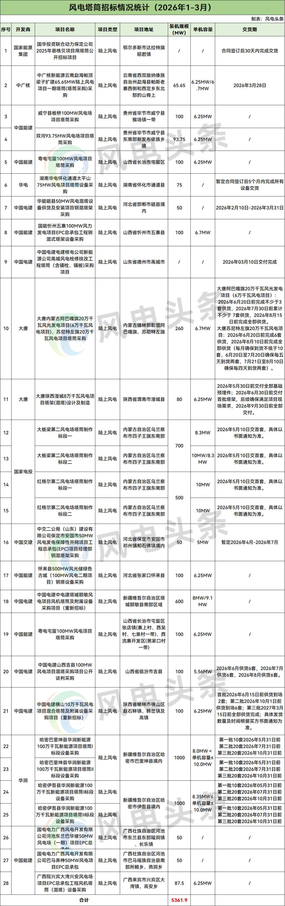 2026年1-3月累计26个风电塔筒采购项目开标,累计容量达到3337.85MW。