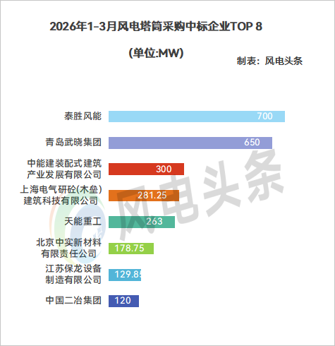 据能源圈统计,2026年1-3月风电塔筒采购项目,共有8家央企发布风电塔筒采购中标信息:国家电投、中国电建、中国能建、大唐、中广核、国家能源集团、华能、华电。