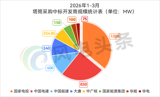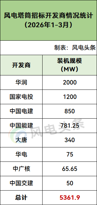 从开发商角度来看,2026年1-3月塔筒采购中标开发商分别是国家电投、中国电建、中国能建、大唐、中广核、国家能源集团、华能、华电8家大型央企。