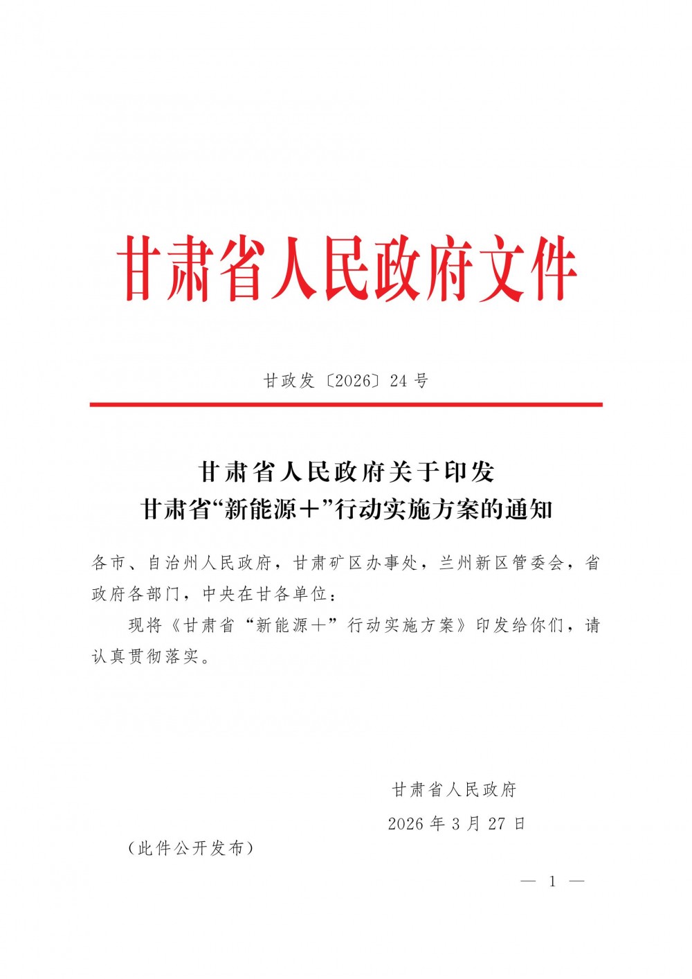 3月31日,甘肃省人民政府下发《甘肃省“新能源+”行动实施方案》。