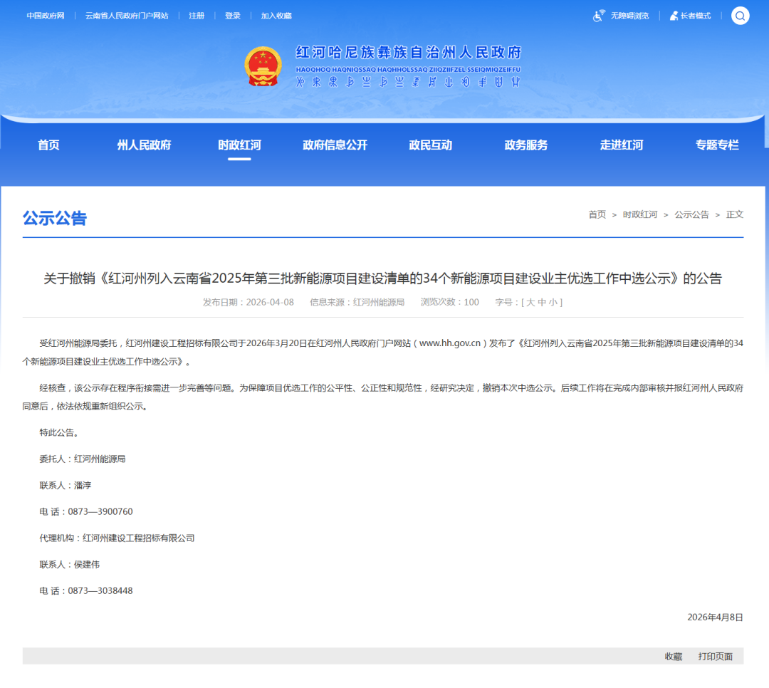 能源圈获悉,4月8日,红河州能源局发布关于撤销《红河州列入云南省2025年第三批新能源项目建设清单的34个新能源项目建设业主优选工作中选公示》的公告。