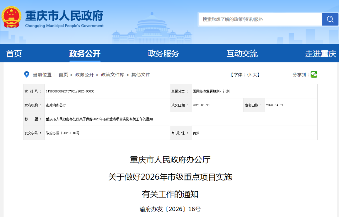 重庆市人民政府办公厅《关于做好2026年市级重点项目实施有关工作的通知》: