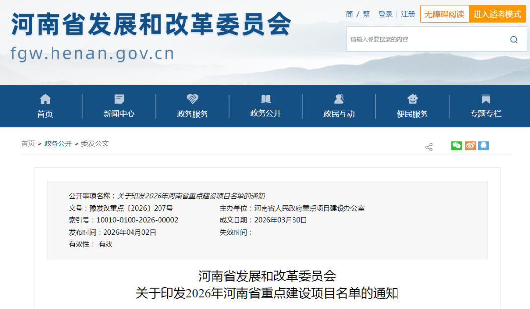 河南省发展和改革委员会《关于印发2026年河南省重点建设项目名单的通知》: