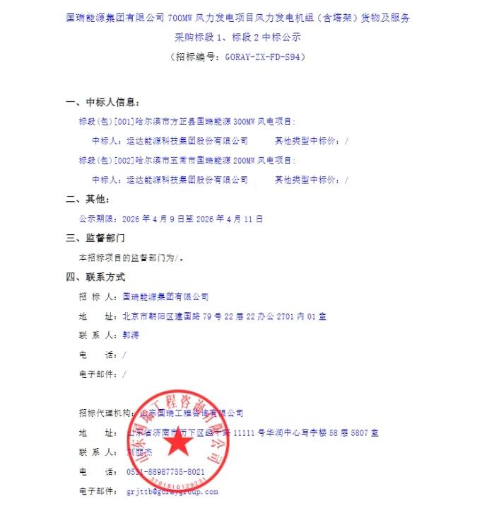 能源圈获悉,4月9日,国瑞能源集团有限公司700MW风力发电项目风力发电机组(含塔架)货物及服务采购标段1、标段2中标公示。