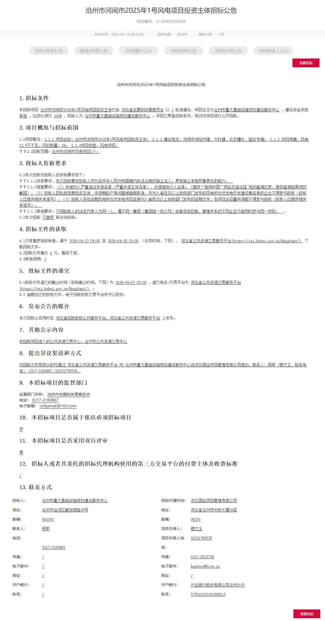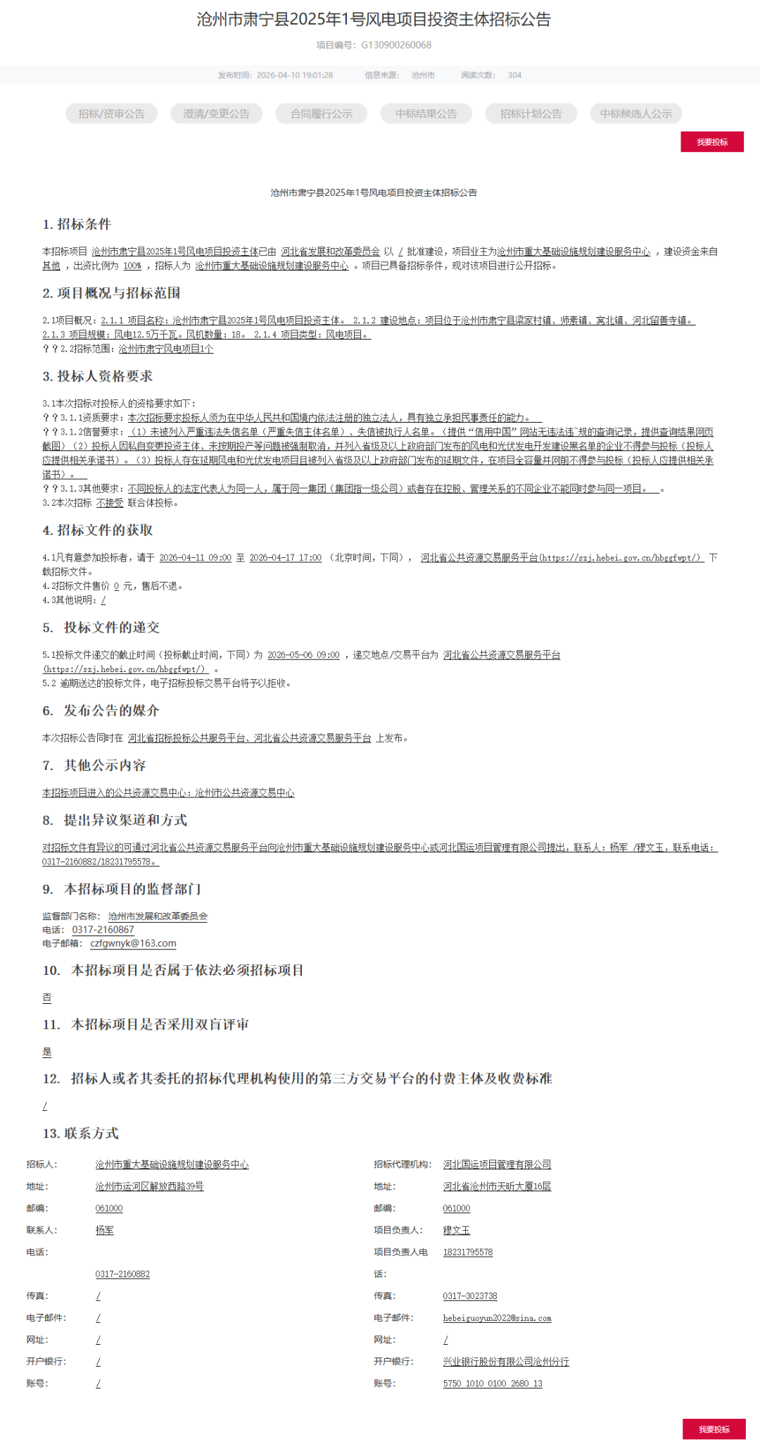 4月11日、13日,《沧州市肃宁县2025年1号风电项目投资主体招标公告》、《沧州市河间市2025年1号风电项目投资主体招标公告》发布。