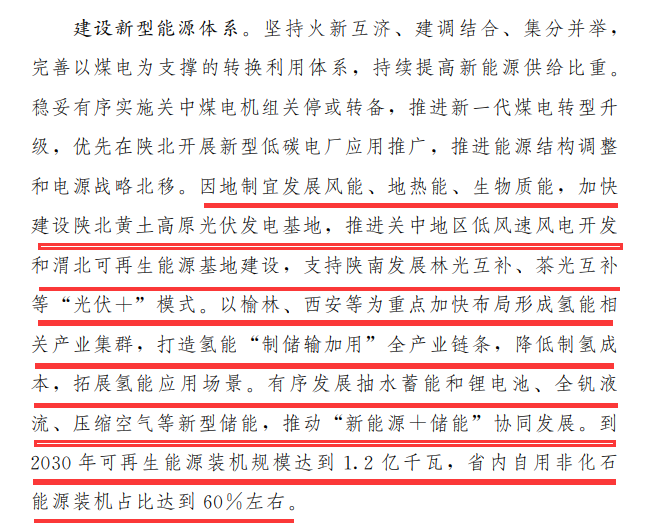 规划纲要明确,因地制宜发展风能、地热能、生物质能,加快建设陕北黄土高原光伏发电基地,推进关中地区低风速风电开发和渭北可再生能源基地建设,支持陕南发展林光互补、茶光互补等“光伏+”模式。