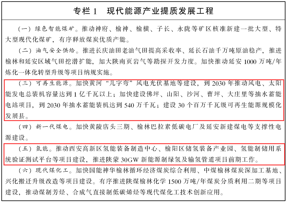 推动西安高新区氢能装备制造中心、榆阳区储氢装备产业园、氢能制储用系统验证测试平台等项目建设,推进陕蒙30GW新能源制绿氢及输氢管道项目前期工作。