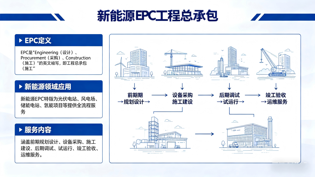 EPC 是Engineering(设计)、Procurement(采购)、Construction(施工) 的英文缩写,即工程总承包模式。在新能源领域,新能源 EPC 特指由具备资质的总承包商,对光伏电站、风电场、储能电站、氢能项目等新能源工程,提供从前期规划设计、设备采购、施工建设,到后期调试、试运行、竣工验收,甚至运维服务的一站式全流程承包服务。