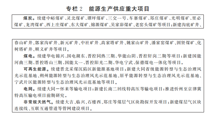 坚持把能源转型作为坚定有序推进转型发展的首要任务,持续深化能源革命,建设“五大基地”,加快从煤炭大省向能源强省转变。其中“可再生能源”项目包含:续建晋北采煤沉陷区新能源基地项目;新建大同省级能源转型与生态治理风光示范基地、朔州能源转型与生态治理风光示范基地、原平能源转型与生态治理风光示范基地、宁武片区能源转型与生态治理风光示范基地等项目。