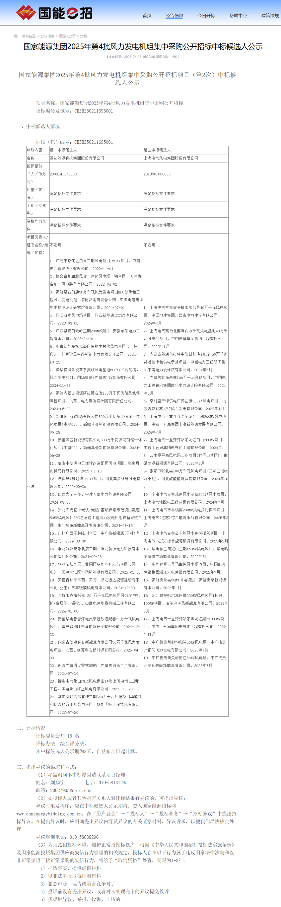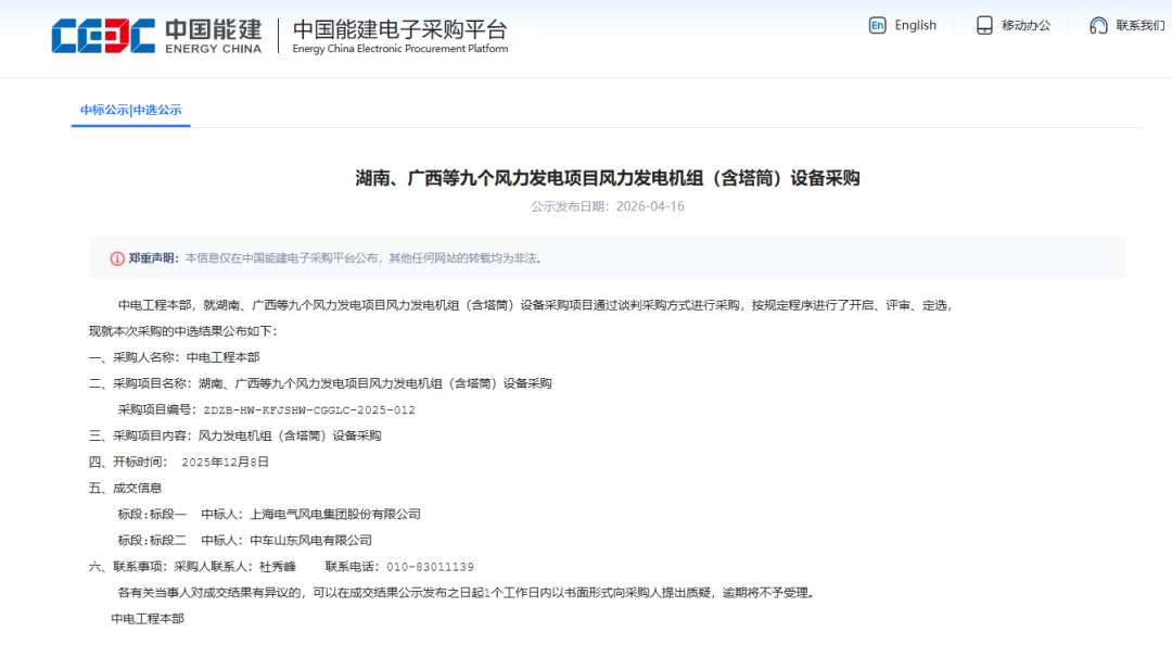 4月16日,国家能源集团2025年第4批风力发电机组集中采购公开招标项目(第2次)中标候选人公示;中国能建湖南、广西等九个风力发电项目风力发电机组(含塔筒)设备采购中选结果公布。