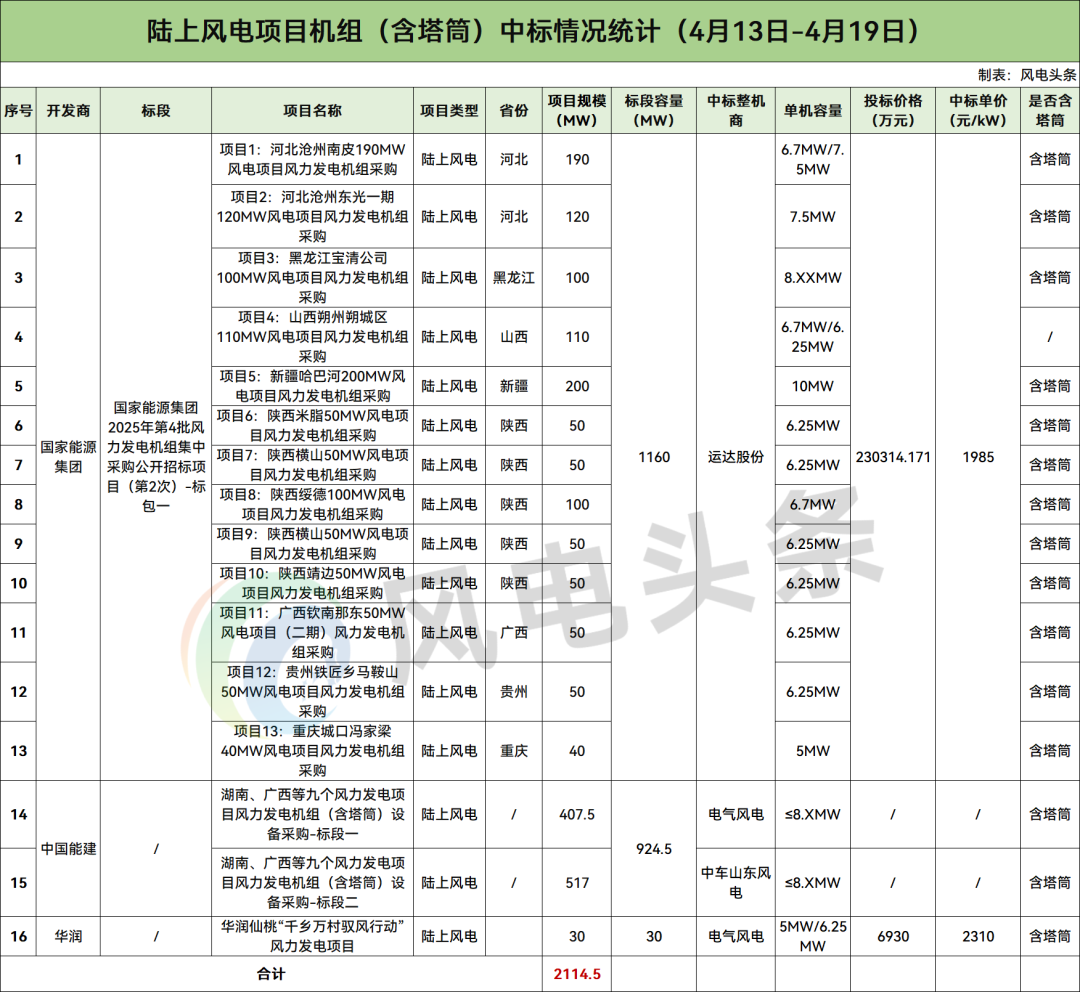 据能源圈统计,本周含塔筒陆上风电项目共计16个,规模总计2114.5MW,项目中标均价为2147.7元/kW。