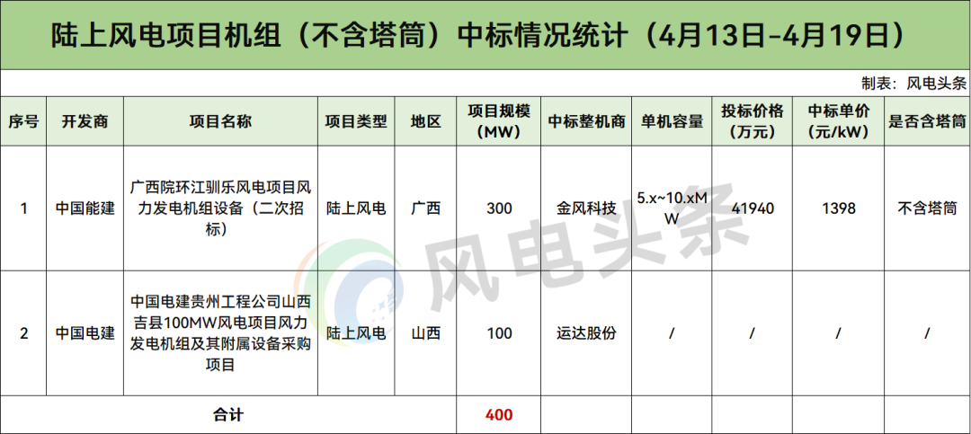 不含塔筒陆上风电400MW
