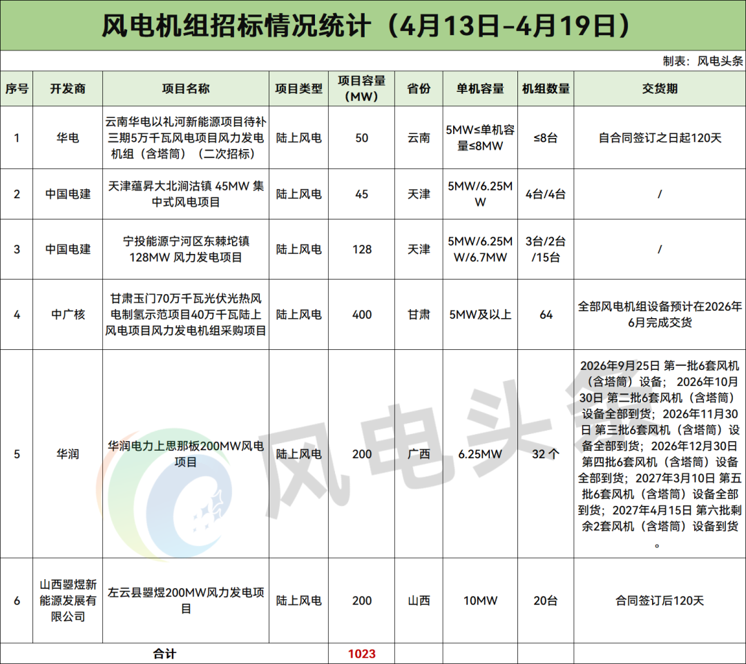 据能源圈统计,2026年4月13日-4月19日风电整机采购开标总计2514.5MW,风电机组招标总计1023MW;风电塔筒开标总计100MW,风电塔筒招标总计300MW。