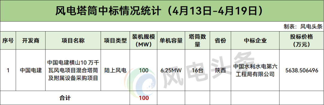 本周获得塔筒订单的企业有1家,为中国水利水电第六工程局有限公司。