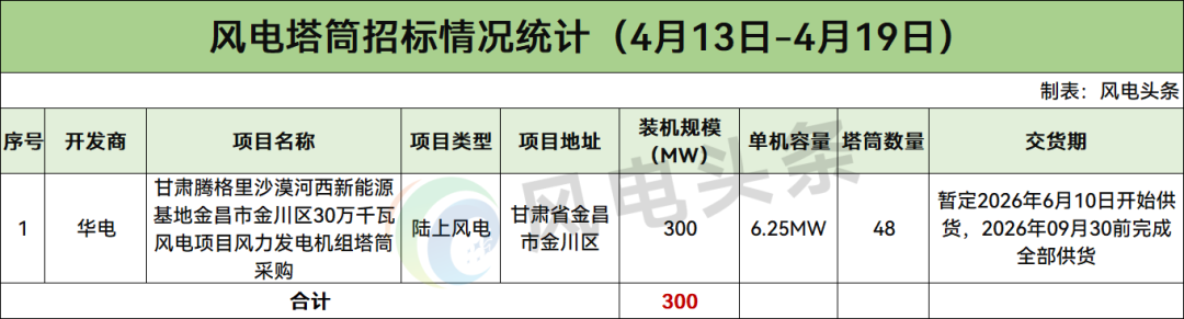根据招标公告,甘肃腾格里沙漠河西新能源基地金昌市金川区30万千瓦风电项目风力发电机组塔筒采购招标人为甘肃腾格里绿色能源有限公司;项目地址为甘肃省金昌市金川区;项目规模30万千瓦风电工程(48*6.25MW);招标项目履约期限暂定2026年6月10日开始供货,2026年09月30前完成全部供货,具体时间以招标人通知时间为准。