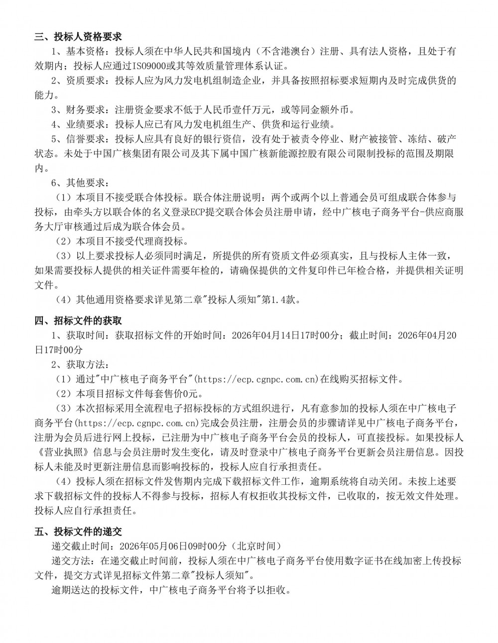 4月15日,中广核新能源甘肃玉门70万千瓦光伏光热风电制氢示范项目40万千瓦陆上风电项目风力发电机组采购项目招标公告发布。