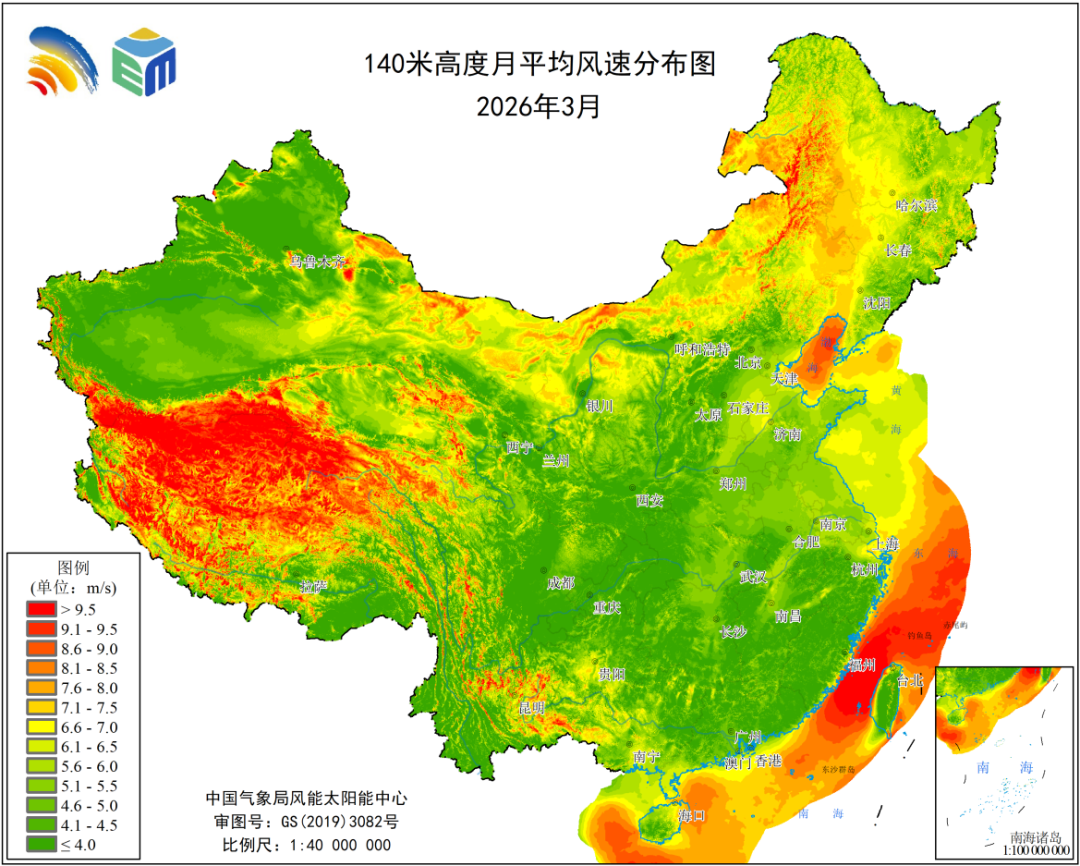 2026年3月,我国140米高度陆地平均风速为5.5m/s。东北、西北、内蒙古、西藏月平均风速大于5.5m/s。其中,西藏、内蒙古、东北地区西部等地达到6.6m/s以上。相比之下,华北、华东、华中、华南、西南、新疆部分地区普遍月平均风速较低,一般低于5.0 m/s。