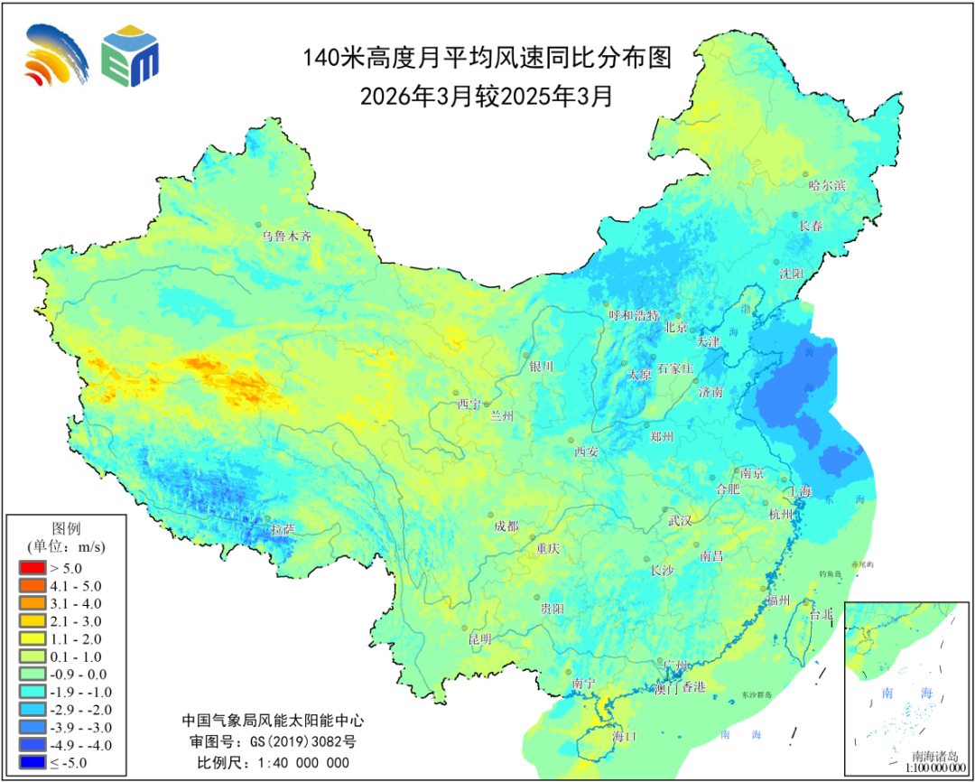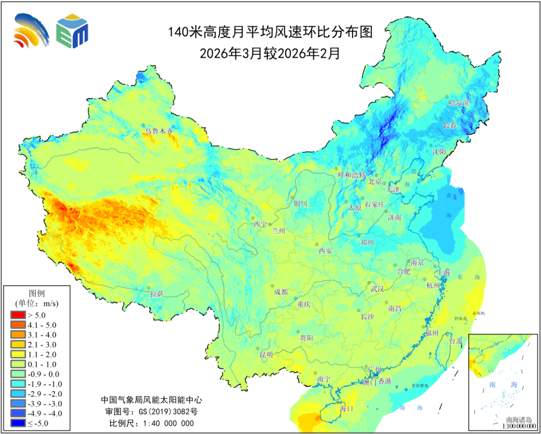 2026年3月,全国140米高度月平均风速环比变化特征与100米高度基本一致。新疆局部、西藏西部和北部增幅普遍在1.0~3.0 m/s,局部地区增幅超过3.0 m/s。东北、内蒙古东部呈现偏小趋势,降幅在1.1~5.0 m/s之间。