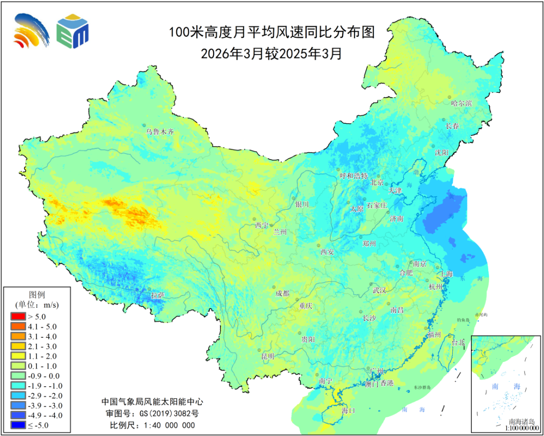 2026年3月,全国大部地区100米高度月平均风速较2026年2月偏大或基本持平。新疆局部、西藏西部和北部环比偏大,偏大幅度一般在1.0~3.0 m/s。其中,西藏西部和北部偏大最显著,局地环比偏大3.0 m/s以上。东北、内蒙古东部风速偏小较为明显,环比偏小幅度在1.1~5.0m/s。